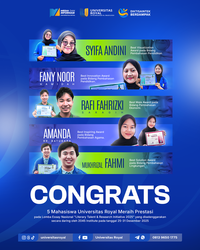 Universitas Royal menyampaikan apresiasi dan kebanggaan atas capaian kelima mahasiswa tersebut. Prestasi ini diharapkan menjadi inspirasi bagi seluruh mahasiswa untuk terus mengembangkan potensi diri serta aktif berpartisipasi dalam kompetisi akademik tingkat nasional maupun internasional.